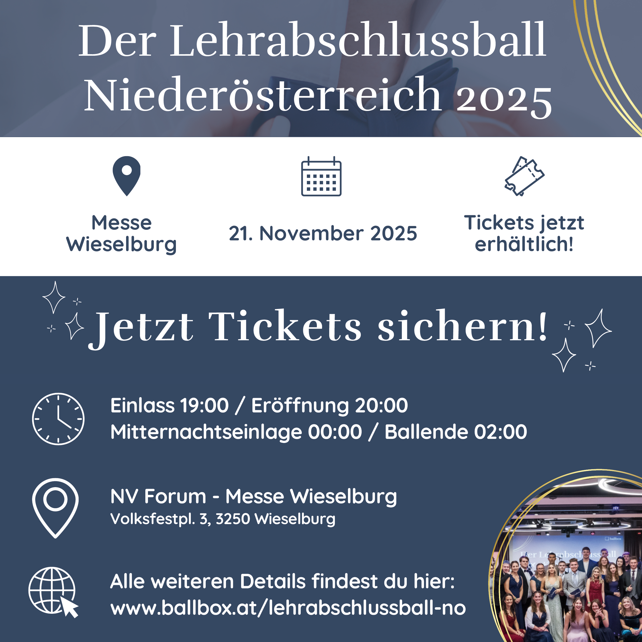 Feiern Sie die herausragenden Leistungen Ihrer Lehrlinge in einem festlichen Rahmen. Der erste Lehrabschlussball Niederösterreichs bietet allen niederösterreichischen Unternehmen die einmalige Gelegenheit, ihre Nachwuchstalente gebührend zu würdigen.