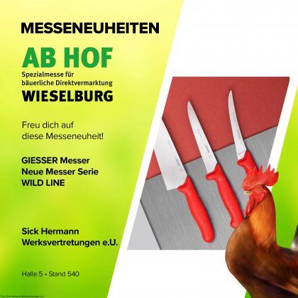 Wer in der lebensmittelverarbeitenden Industrie tätig ist, benötigt Messer, die Schärfe, Hygiene, Sicherheit und Zuverlässigkeit bieten. Die innovative PrimeLine Serie - WILD LINE - von GIESSER wurde speziell für Fleischer und Jäger entwickelt. Mit verschiedenen Klingenformen, -längen und Griffoptionen ist die Wild Line Serie ideal für alle Arbeitsbereiche in der Fleischverarbeitung geeignet. Die optimale Balance und Proportionen zwischen Klinge und Griff sorgen für müheloses und ermüdungsfreies Schneiden, während die gerundete Griffform mit Schutznase Sehnen und Gelenke schont. Dank des rutschfesten, stabilen Griffs und der hochwertigen Klingen aus Chrom-Molybdän-Stahl ist die WildLine Serie ein ergonomisches Meisterwerk für sicheres und präzises Arbeiten.